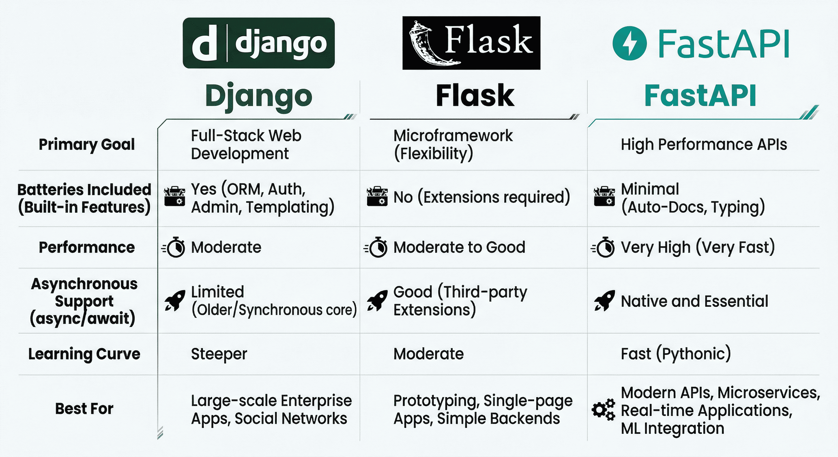 Most of the new and upcoming developers are confused about which framework to choose, when selecting python as their primary language. Either to build AI agents or building a backend. Just your friendly python developer, hope it will be useful. Django is a batteries-included framework. It comes with: Built-in admin panel Authentication system Database ORM Form handling Security features (CSRF, XSS protection) Who Should Start With Django: 1. You want to build complete web applications quickly 2. You prefer having one "official way" of doing things 3. You want strong job security with enterprise companies 4. You're building e-commerce, CMS, or SaaS products Flask is a micro-framework. It gives you the bare minimum and lets you add what you need: Simple routing Template engine (Jinja2) Everything else you choose yourself Who Should Start With Flask: 1. You're learning web development for the first time 2. You want to understand how frameworks work under the hood 3. You're building small APIs or microservices 4. You prefer choosing your own tools (database, authentication, etc.) FastAPI is a modern, high-performance framework built for: Async support (non-blocking code) Automatic API documentation Type safety with Python type hints (Pydantic Versions) Who Should Start With FastAPI 1. You're building AI agents or LLM-powered applications 2. You're creating high-performance APIs 3. You want automatic API docs (Swagger UI) 4. You're working with async operations (WebSockets, real-time)