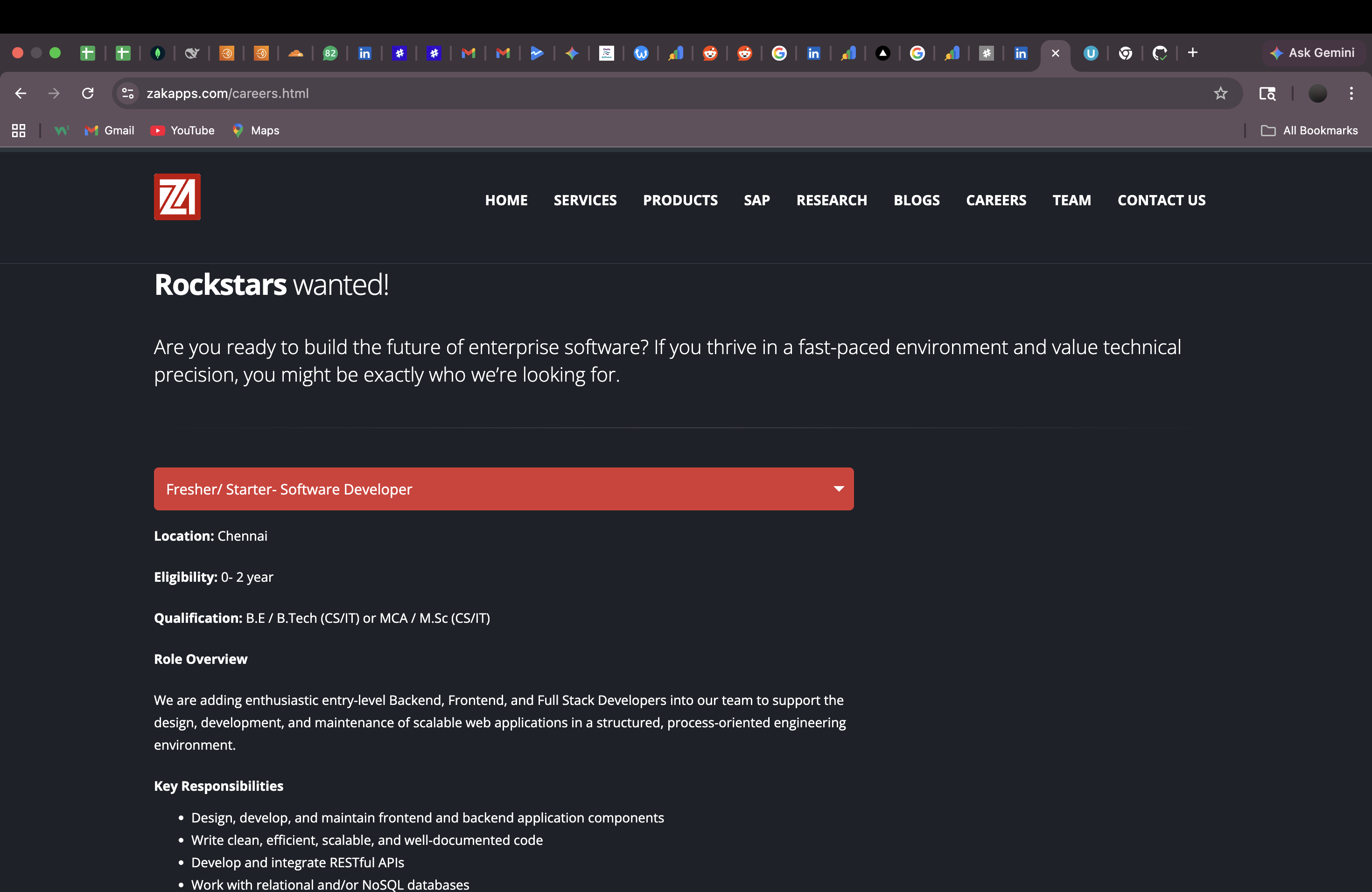 Please find the attached link for job application. Apply link: https://www.zakapps.com/careers.html Location: Chennai Eligibility: 0- 2 year Qualification: B.E / B.Tech (CS/IT) or MCA / M.Sc (CS/IT) Role Overview We are adding enthusiastic entry-level Backend, Frontend, and Full Stack Developers into our team to support the design, development, and maintenance of scalable web applications in a structured, process-oriented engineering environment. Key Responsibilities Design, develop, and maintain frontend and backend application components Write clean, efficient, scalable, and well-documented code Develop and integrate RESTful APIs Work with relational and/or NoSQL databases Perform debugging, testing, and performance optimization Participate in code reviews and follow best coding practices Collaborate with cross-functional teams to understand requirements and deliver solutions Follow SDLC processes and Agile methodologies Must-Have Skills Strong understanding of Data Structures and Algorithms Proficiency in Java and Spring Boot Solid knowledge of HTML5, CSS3, and JavaScript Hands-on experience with at least one frontend framework (React / Angular / Vue.js) Experience in building and consuming RESTful APIs Understanding of CRUD operations and database fundamentals (MySQL / PostgreSQL / MongoDB) Familiarity with Git or other version control systems Basic knowledge of Software Development Life Cycle (SDLC) and Agile practices Strong analytical, logical reasoning, and problem-solving skills Good-to-Have Exposure to cloud platforms (AWS / Azure / GCP) or deployment fundamentals Familiarity with API testing tools (e.g., Postman) Understanding of caching tools such as Redis / Ehcache Understanding of authentication and authorization concepts (e.g., JWT basics) Basic knowledge of CI/CD concepts